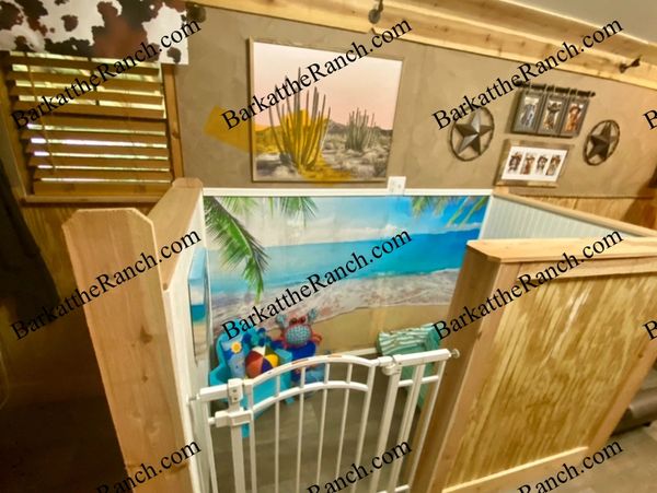 Check out our roomy 7.5 ft. x 8 ft. beach themed suite βBark at the Beachβ which includes beach themed toys, bedding and a private doggy pool for your dog to access. In addition, your pup will have exclusive access to a large private out door covered play area . There is also a covered place to potty.